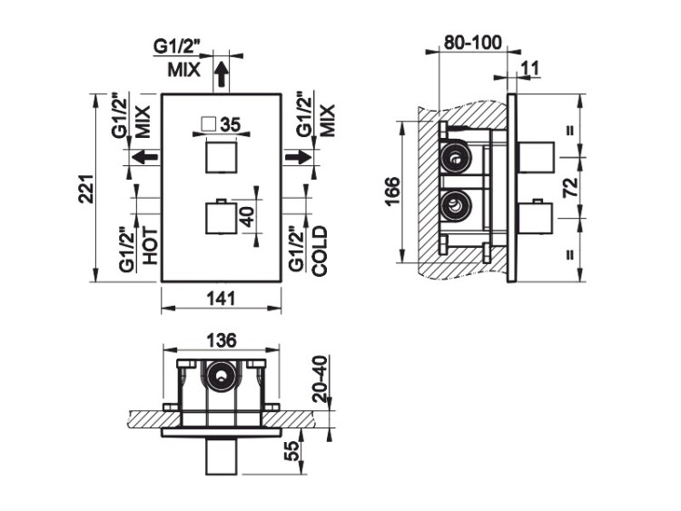 Смеситель для душа, Gessi, Rettangolo shower, тип регулирования воды-термостатический картридж, тип установки-встраиваемый, внутренняя часть-необходимо заказать, цвет-хром, фильтра ми и c переключателем с керамическими дисками, на три позиции на 1/2" Смеситель для душа, Gessi, Rettangolo shower, цвет-хром