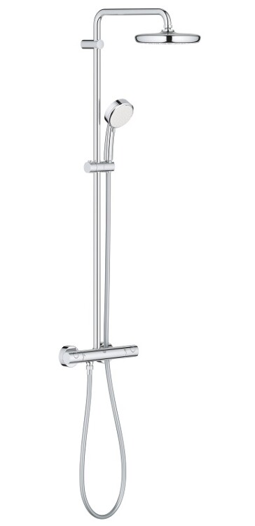 Душевая стойка, Grohe, Tempesta Cosmopolitan, смеситель-в комплекте, тип открывания воды-вентильный, тип регулирования воды-термостатический картридж, верхний душ-есть, форма верхнего душа-круглая, размер верхнего душа,мм-210, держатель верхнего душа-есть, вынос, мм-390, количество режимов верхнего душа-1, тип струи верхнего душа-дождь, размер штанги, мм-1132, ручной душ-в комплекте, количество режимов ручного душа-2, тип струи ручного душа-Rain, Jet, шланг-есть, размер шланга, мм-1750, цвет-хром Душевая стойка, Grohe, Tempesta Cosmopolitan, цвет-хром