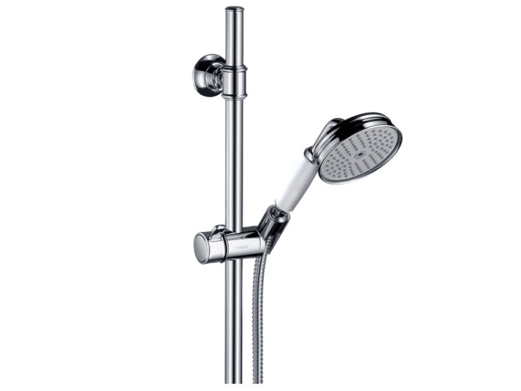 Душевой гарнитур, Axor, Axor Montreux, размер штанги, мм-900, металлический шланг, размер шланга, мм-1600, ручной душ с белой рукояткой, диаметр ручного душа, мм-100, количество режимов-1, тип струи-RainAir, цвет-хром, держатель для душевого шланга с конической гайкой, хромированные настенные крепления из металла Душевой гарнитур, Axor, Axor Montreux, цвет-хром