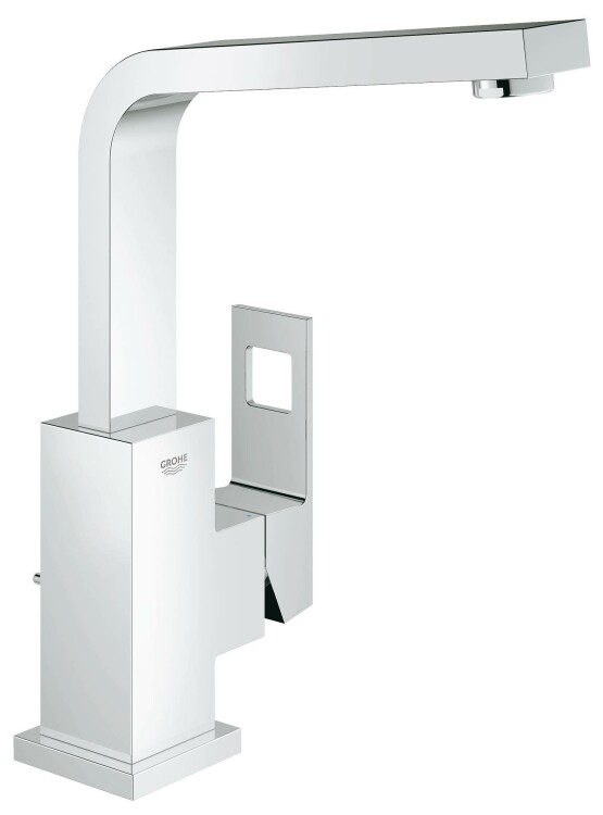 Смеситель для раковины, Grohe, Eurocube, тип открывания воды-однорычажный, тип регулирования воды-керамический картридж, монтаж-на раковину/столешницу, отверстия для монтажа-1, высота, мм-248, вынос излива, мм-150, тип излива-поворотный, донный клапан-есть, тип подводки-гибкая, стандарт подвода воды-3/8", цвет-хром Смеситель для раковины, Grohe, Eurocube, цвет-хром