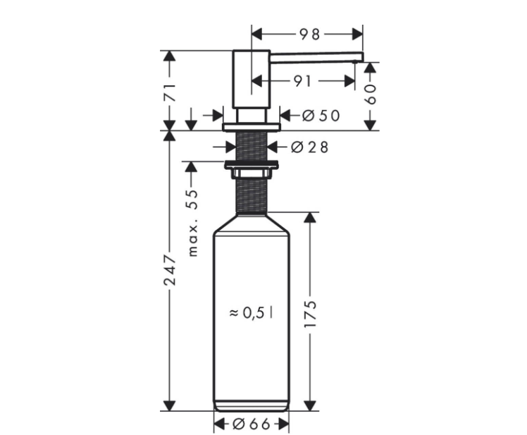 Дозатор для жидкого мыла, Hansgrohe, A41, механический (нажимной), ширина, мм-131, глубина, мм-66, высота, мм-318, ёмкость(мл)-500, тип установки-встраиваемый, материал колбы-металл, цвет дозатора-черный матовый Дозатор для жидкого мыла, Hansgrohe, A41, шгв 131*66*318, цвет дозатора-черный матовый