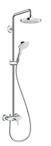 Душевая стойка, Hansgrohe, Croma Select E, смеситель-есть, тип открывания воды-однорычажный, тип регулирования воды-керамический картридж, верхний душ-есть, форма верхнего душа-квадратная, размер верхнего душа-180, держатель верхнего душа-есть, вынос, мм-486, количество режимов верхнего душа-2, тип струи верхнего душа-Rain, Intense Rain, размер штанги, мм-1141, ручной душ-есть, размер ручного душа-110, количество режимов ручного душа-3, тип струи ручного душа-Soft Rain, Intense Rain, массажная струя, шланг-есть, размер шланга, мм-1600, цвет-белый/хром Душевая стойка, Hansgrohe, Croma Select E, цвет-белый/хром