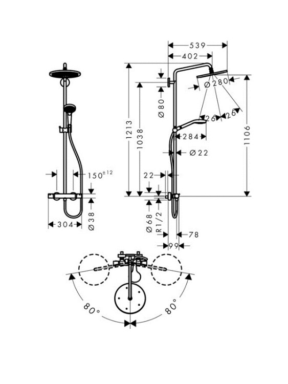 Душевая стойка, Hansgrohe, Croma Select S, смеситель-есть, тип регулирования воды-термостатический картридж, верхний душ-есть, форма верхнего душа-круглая, размер верхнего душа-280, держатель верхнего душа-есть, поворотный, вынос, мм-400, регулируемый угол верхнего душа, количество режимов верхнего душа-1, тип струи верхнего душа-RainAir, размер штанги, мм-1038, ручной душ-есть, шланг-есть, предохранительный ограничитель при 40° C, регулируемый ограничитель температуры горячей воды, пользовательское управление посредством вращения рукоятки, соединительная резьба G ½, регулируемое по высоте крепление ручного душа, цвет-хром Душевая стойка, Hansgrohe, Croma Select S, цвет-хром