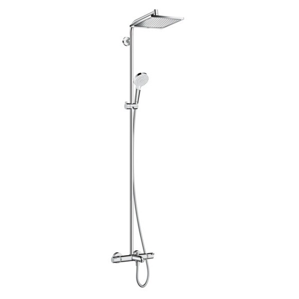 Душевая стойка, Hansgrohe, Crometta E, смеситель-есть, тип открывания воды-вентильный, тип регулирования воды-термостатический картридж, излив-есть, вынос излива, мм-182, верхний душ-есть, форма верхнего душа-квадратная, размер верхнего душа-240*240, держатель верхнего душа-есть, вынос, мм-355, количество режимов верхнего душа-1, тип струи-ïïтип струи: Rain, размер штанги, мм-1380, ручной душ-есть, размер ручного душа-100, количество режимов ручного душа-2, тип струи-Rain, IntenseRain, шланг-есть, размер шланга, мм-1600, цвет-хром, пользовательское управление посредством вращения рукоятки Душевая стойка, Hansgrohe, Crometta E, цвет-хром