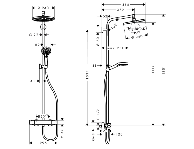Душевая стойка, Hansgrohe, Crometta S, смеситель-есть, тип открывания воды-вентильный, тип регулирования воды-термостатический картридж, верхний душ-есть, форма верхнего душа-круглая, размер верхнего душа-240, держатель верхнего душа-есть, вынос, мм-352, количество режимов верхнего душа-1, тип струи верхнего душа-Rain, размер штанги, мм-1034, ручной душ-есть, размер ручного душа-100, количество режимов ручного душа-2, тип струи ручного душа-Rain, Intense Rain, шланг-есть, размер шланга, мм-1600, цвет-хром Душевая стойка, Hansgrohe, Crometta S, цвет-хром