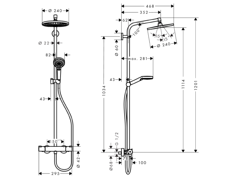 Душевая стойка, Hansgrohe, Crometta S, смеситель-есть, тип открывания воды-двухвентильный, тип регулирования воды-термостатический картридж, верхний душ-есть, форма верхнего душа-круглая, размер верхнего душа-240, держатель верхнего душа-есть, вынос, мм-352, количество режимов верхнего душа-1, тип струи верхнего душа-Rain, размер штанги, мм-1034, ручной душ-есть, размер ручного душа-100, количество режимов ручного душа-2, тип струи ручного душа-Rain, Intense Rain, шланг-есть, размер шланга, мм-1600, цвет-хром Душевая стойка, Hansgrohe, Crometta S, цвет-хром