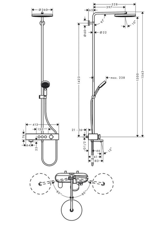 Душевая стойка, Hansgrohe, Pulsify S, тип регулирования воды-термостатический картридж, излив-есть, вынос излива, мм-161, верхний душ-есть, форма верхнего душа-круглая, размер верхнего душа,мм-260, держатель верхнего душа-есть, вынос, мм-397, количество режимов верхнего душа-1, размер штанги, мм-1500, ручной душ-в комплекте, количество режимов ручного душа-3, шланг-есть, размер шланга, мм-1600, цвет-хром Душевая стойка, Hansgrohe, Pulsify S, цвет-хром