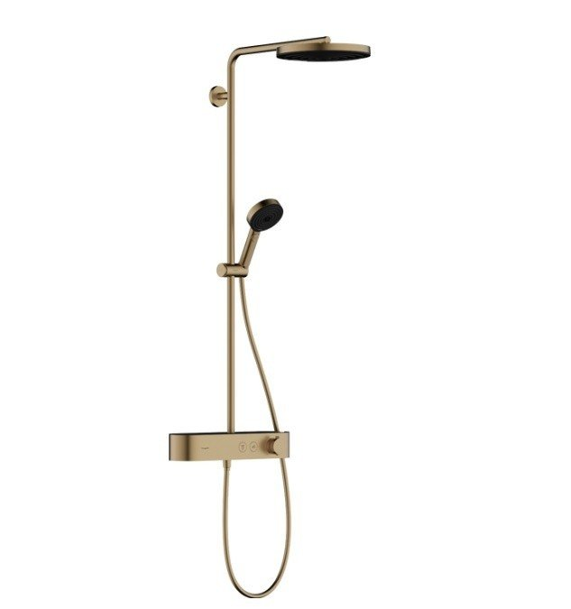 Душевая стойка, Hansgrohe, Pulsify S, смеситель-в комплекте, тип открывания воды-вентильный, тип регулирования воды-термостатический картридж, верхний душ-есть, форма верхнего душа-круглая, размер верхнего душа,мм-260, держатель верхнего душа-есть, вынос, мм-397, количество режимов верхнего душа-1, размер штанги, мм-997, ручной душ-в комплекте, количество режимов ручного душа-3, шланг-есть, размер шланга, мм-1600, цвет-бронза шлифованная Душевая стойка, Hansgrohe, Pulsify S, цвет-бронза шлифованная