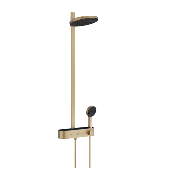 Душевая стойка, Hansgrohe, Pulsify S, EcoSmart, водосберегающая модель, смеситель-есть, тип регулирования воды-термостатический картридж, с кнопками "ручной душ", "PowderRain", "Intense PowderRain", верхний душ-есть, форма верхнего душа-круглая, размер верхнего душа,мм-260, держатель верхнего душа-есть, шарнирное соединение: верхний душ с углом наклона 10-30°, вынос, мм-163, поверхность душевого диска-графит, количество режимов верхнего душа-2, тип струи-PowderRain, Intense PowderRain, ручной душ-есть, количество режимов ручного душа-3, тип струи-PowderRain, IntenseRain, массажная, полка из пластика, цвет-шлифованная бронза Душевая стойка, Hansgrohe, Pulsify S, EcoSmart, с ShowerTablet Select 400, цвет-шлифованная бронза