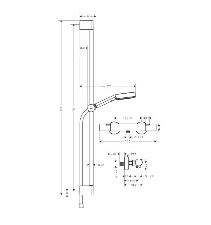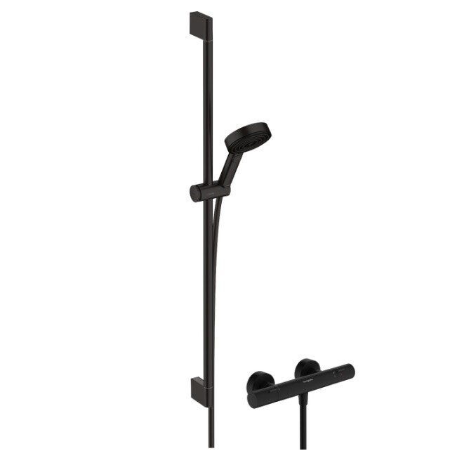 Душевой гарнитур, Hansgrohe, Pulsify Select, смеситель-в комплекте, тип регулирования воды-термостатический картридж, размер штанги, мм-959, шланг-есть, держатель для шланга-в комплекте, размер душевого диска, мм-105, форма лейки-круглая, количество режимов-3, тип струи-PowderRain, IntenseRain, массажная струя, цвет-черный матовый Душевой гарнитур, Hansgrohe, Pulsify Select, 105, цвет-черный матовый