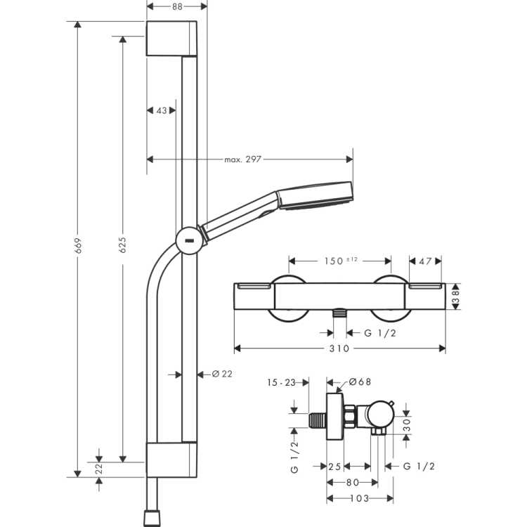 Душевой гарнитур, Hansgrohe, Pulsify Select, смеситель-в комплекте, тип регулирования воды-термостатический картридж, размер штанги, мм-669, шланг-есть, держатель для шланга-в комплекте, размер душевого диска, мм-105, форма лейки-круглая, количество режимов-3, тип струи-PowderRain, IntenseRain, массажная струя, цвет-черный матовый Душевой гарнитур, Hansgrohe, Pulsify Select, 105, цвет-черный матовый