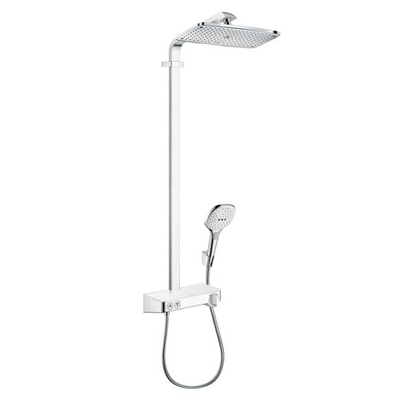 Душевая стойка, Hansgrohe, Raindance E, тип регулирования воды-термостатический картридж, верхний душ-есть, форма верхнего душа-квадратная, размер верхнего душа-360*190, держатель верхнего душа-есть, вынос, мм-380, количество режимов верхнего душа-1, тип струи верхнего душа-RainAir, ручной душ-есть, размер ручного душа-120, количество режимов ручного душа-3, тип струи ручного душа-Rain, RainAir, WhirlAir, шланг-есть, размер шланга, мм-1600, цвет-белый/хром Душевая стойка, Hansgrohe, Raindance E, цвет-белый/хром