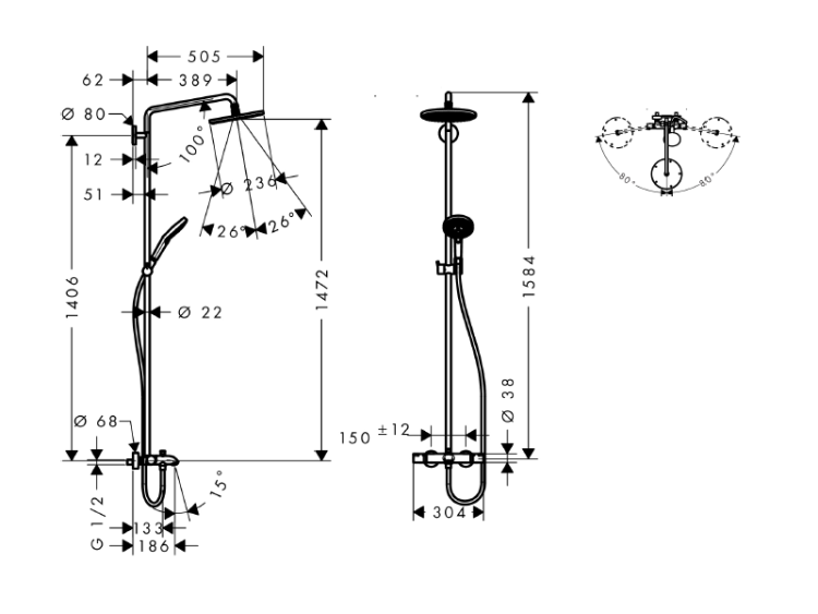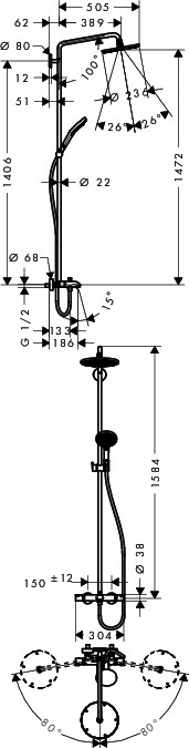 Душевая стойка, Hansgrohe, Raindance S, смеситель-есть, тип открывания воды-двухвентильный, тип регулирования воды-термостатический картридж, верхний душ-есть, форма верхнего душа-круглая, размер верхнего душа-240, держатель верхнего душа-есть, вынос, мм-389, количество режимов верхнего душа-1, тип струи верхнего душа-RainAir, размер штанги, мм-1472, ручной душ-есть, размер ручного душа-125, количество режимов ручного душа-3, тип струи ручного душа-Rain, RainAir, WhirlAir, шланг-есть, размер шланга, мм-2000, цвет-хром Душевая стойка, Hansgrohe, Raindance S, цвет-хром