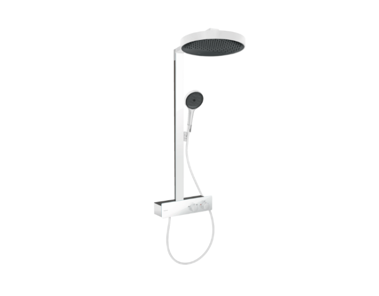 Душевая стойка, Hansgrohe, Rainfinity, смеситель-в комплекте, тип открывания воды-вентильный, тип регулирования воды-термостатический картридж, верхний душ-есть, форма верхнего душа-круглая, размер верхнего душа,мм-360, держатель верхнего душа-есть, вынос, мм-405, количество режимов верхнего душа-1, размер штанги, мм-1066, ручной душ-в комплекте, количество режимов ручного душа-3, шланг-есть, цвет-белый матовый Душевая стойка, Hansgrohe, Rainfinity, цвет-белый матовый