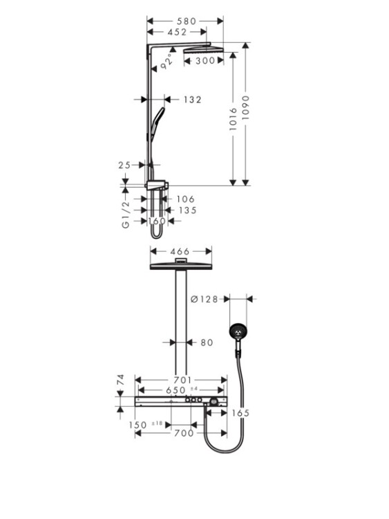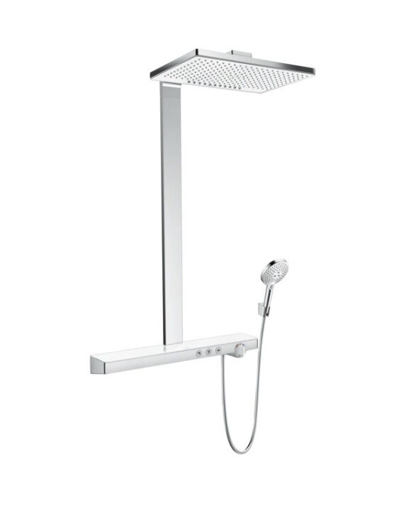 Душевая стойка, Hansgrohe, Rainmaker Select, смеситель-есть, тип открывания воды-вентильный, тип регулирования воды-термостатический картридж, верхний душ-есть, форма верхнего душа-прямоугольная, размер верхнего душа-460*300, держатель верхнего душа-есть, вынос, мм-452, количество режимов верхнего душа-2, тип струи-Rain, RainStream, размер штанги, мм-1090, ручной душ-есть, размер ручного душа-128, количество режимов ручного душа-3, тип струи-Rain, RainAir, Whirl, шланг-есть, размер шланга, мм-1600, цвет-хром Душевая стойка, Hansgrohe, Rainmaker Select, цвет-хром