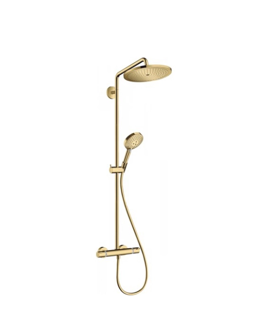 Душевая стойка, Hansgrohe, Croma Select S, смеситель-есть, тип регулирования воды-термостатический картридж, верхний душ-есть, форма верхнего душа-круглая, размер верхнего душа,мм-280, держатель верхнего душа-есть, количество режимов верхнего душа-1, тип струи-RainAir, ручной душ-есть, количество режимов ручного душа-3, тип стуи-Rain, RainAir, Whirl, цвет-полированное золото Душевая стойка, Hansgrohe, Croma Select S, цвет-полированное золото