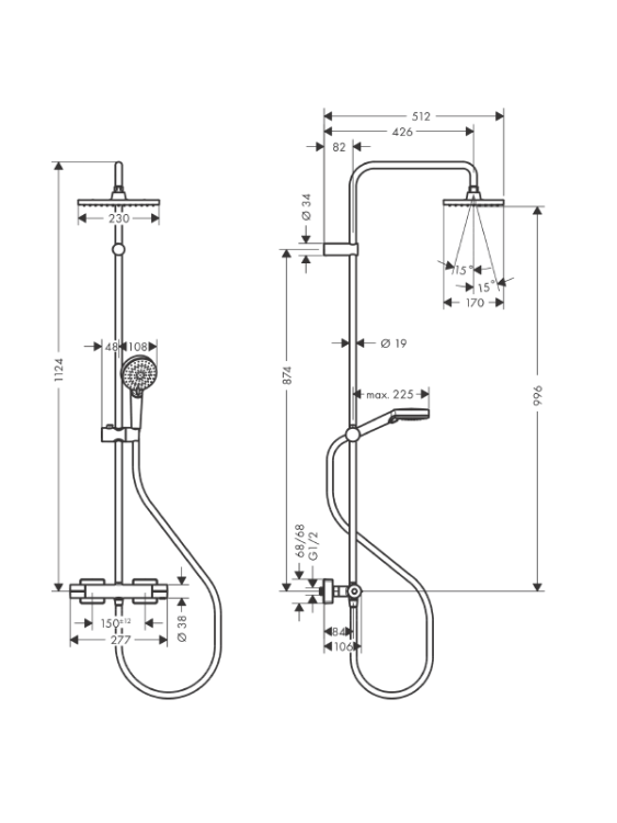 Душевая стойка, Hansgrohe, Vernis Shape, смеситель-в комплекте, тип открывания воды-вентильный, тип регулирования воды-термостатический картридж, верхний душ-есть, форма верхнего душа-прямоугольная, размер верхнего душа-230*170, держатель верхнего душа-есть, вынос, мм-426, количество режимов верхнего душа-1, размер штанги, мм-1124, ручной душ-в комплекте, количество режимов ручного душа-2, шланг-есть, размер шланга, мм-1500, цвет-хром Душевая стойка, Hansgrohe, Vernis Shape, цвет-хром