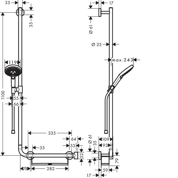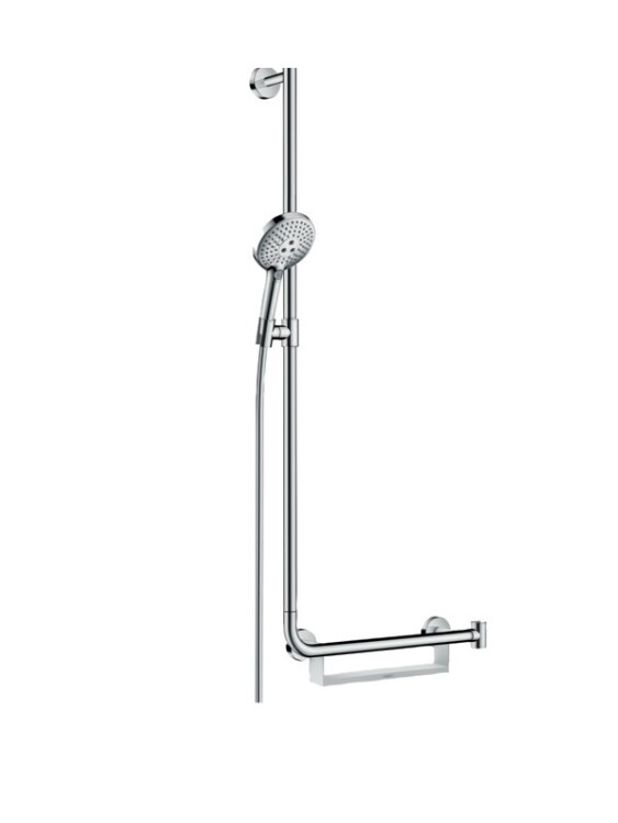 Душевой гарнитур, Hansgrohe, Raindance Select S, размер штанги, мм-1100, размер шланга, мм-1600, диаметр ручного душа, мм-120, количество режимов-3, тип струи-RainAir, Rain, WhirlAir, комплектация-держатель ручного душа, сьемная полочка, цвет-хром Душевой гарнитур, Hansgrohe, Raindance Select S, цвет-хром