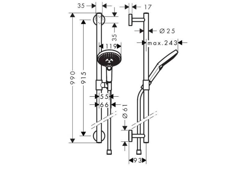Душевой гарнитур, Hansgrohe, Raindance Select S, размер штанги, мм-900, ширина штанги,мм- 25, материал-латунь, диаметр ручного душа, мм-120, количество режимов-3, тип струи-RainAir, Rain, WhirlAir, удобное переключение типов струи с помощью кнопки Select, шланг для душа, со стороны душа упорный подшипник, предотвращающий перекручивание душевого шланга, полностью хромированный держатель душа из металла, регулируется в пределах 90°, поворачивается вправо и влево, перемещается вверх и вниз, хромированные настенные крепления из металла, цвет-хром Душевой гарнитур, Hansgrohe, Raindance Select S, цвет-хром