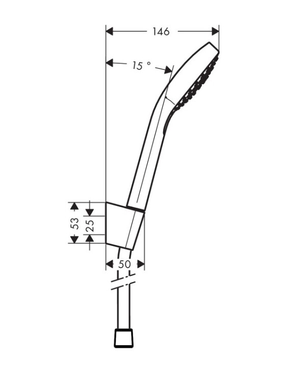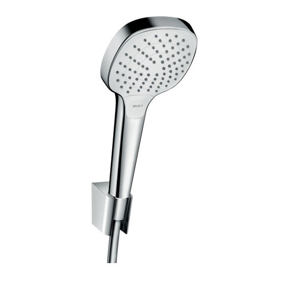 Душевой набор, Hansgrohe, Croma Select E, размер душевого диска, мм-110, форма лейки-квадратная, количество режимов-3, тип струи-Rain, Intense Rain, Turbo Rain, держатель для душа-есть, шланг-есть, длина шланга, мм-1600, цвет-белый/хром Душевой набор, Hansgrohe, Croma Select E, цвет-белый/хром