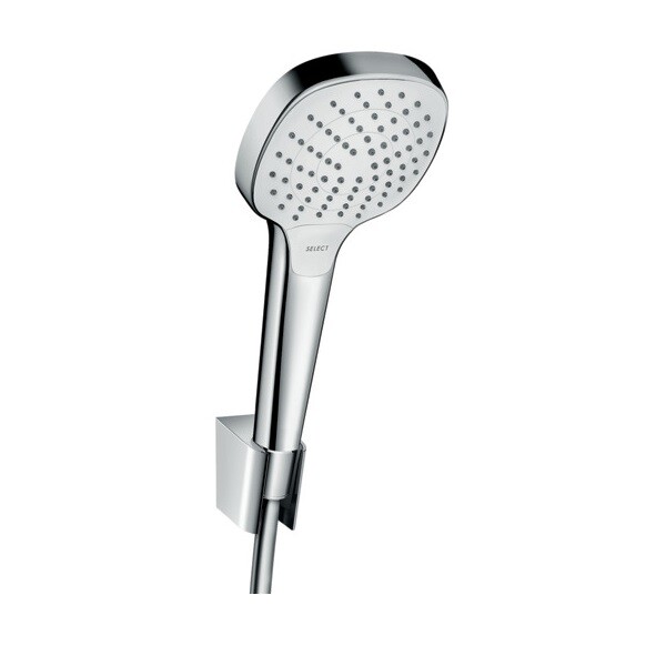 Душевой набор, Hansgrohe, Croma Select E, размер душевого диска, мм-110, форма лейки-круглая, количество режимов-3, тип струи-Rain, IntenseRain, Turbo Rain, держатель для душа-есть, шланг-есть, длина шланга, мм-1250, цвет-хром/белый Душевой набор, Hansgrohe, Croma Select E, цвет-хром/белый