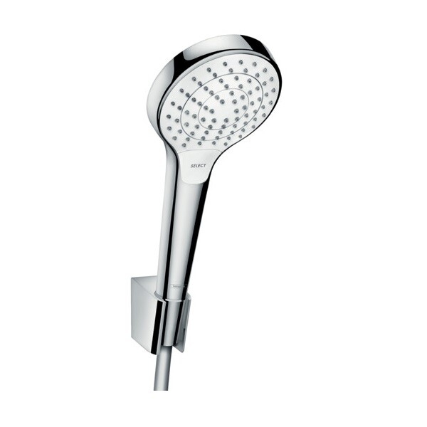 Душевой набор, Hansgrohe, Croma Select S, размер душевого диска, мм-110, форма лейки-круглая, количество режимов-3, тип струи-Rain, Intense Rain, Turbo Rain, держатель для душа-есть, шланг-есть, длина шланга, мм-1600, цвет-белый/хром Душевой набор, Hansgrohe, Croma Select S, цвет-белый/хром