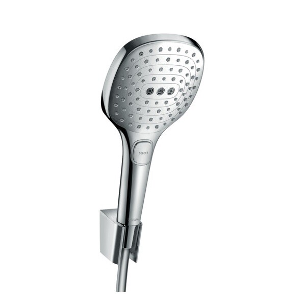 Душевой набор, Hansgrohe, Raindance Select E, диаметр лейки, мм-120, форма лейки-круглая, количество режимов-3, тип струи-RainAir, Rain, массажная, держатель для душа-есть, шланг-есть, длина шланга, мм-1250, цвет-хром Душевой набор, Hansgrohe, Raindance Select E, цвет-хром