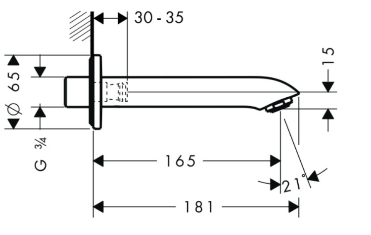 Излив, Hansgrohe, Metris, тип установки-настенный, вынос излива, мм-165, стандарт подводки-3/4", цвет-хром Излив, Hansgrohe, Metris, цвет-хром