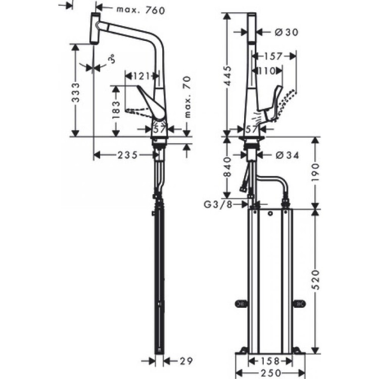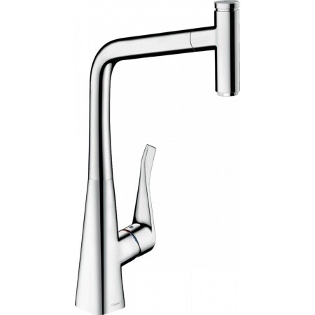 Смеситель для кухни, Hansgrohe, Metris Select M71, sBox, тип открывания воды-однорычажный, тип регулирования воды-керамический картридж, монтаж-на раковину/столешницу, отверстия для монтажа-1, высота, мм-445, вынос излива, мм-235, тип излива-выдвижной, поворотный на 110° или 150°, корпус для шланга, кнопка Select для комфортного включения/выключения воды, магнитная система крепления душа MagFit, тип подводки-гибкая, стандарт подвода воды-3/8", цвет-хром Смеситель для кухни, Hansgrohe, Metris Select M71, sBox, цвет-хром