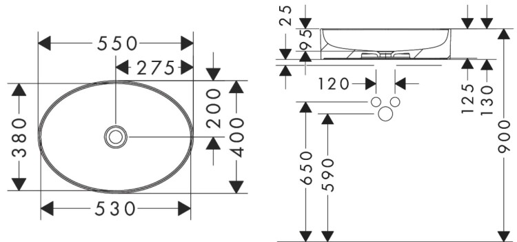 Раковина, Hansgrohe, Xuniva D, ширина, мм-550, глубина, мм-400, высота, мм-130, тип установки-накладной (настольный), отверстия для смесителя-отсутствуют, без перелива, материал-керамика, крепления в комплекте, цвет-белый Раковина, Hansgrohe, Xuniva D, шгв 550*400*130, отверстия для смесителя-отсутствуют, цвет-белый