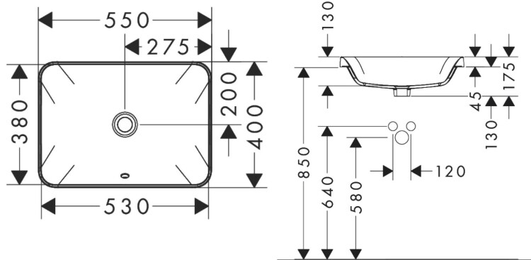 Раковина, Hansgrohe, Xuniva Q, ширина, мм-550, глубина, мм-400, высота, мм-175, тип установки-встраиваемый, отверстия для смесителя-отсутствуют, с переливом, материал-керамика, цвет-белый Раковина, Hansgrohe, Xuniva Q, шгв 550*400*175, отверстия для смесителя-отсутствуют, цвет-белый
