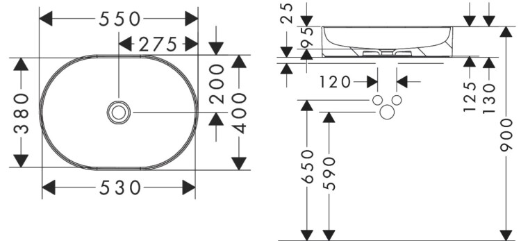 Раковина, Hansgrohe, Xuniva U, ширина, мм-550, глубина, мм-400, высота, мм-130, тип установки-накладной (настольный), отверстия для смесителя-отсутствуют, без перелива, материал-керамика, крепления в комплекте, цвет-белый Раковина, Hansgrohe, Xuniva U, шгв 550*400*130, отверстия для смесителя-отсутствуют, цвет-белый