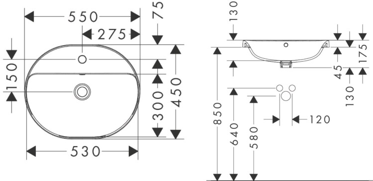 Раковина, Hansgrohe, Xuniva U, ширина, мм-550, глубина, мм-450, высота, мм-175, тип установки-встраиваемый, отверстия для смесителя-1, с переливом, материал-керамика, цвет-белый Раковина, Hansgrohe, Xuniva U, шгв 550*450*175, отверстия для смесителя-1, цвет-белый