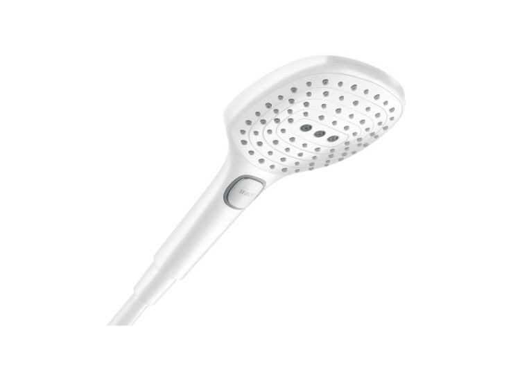 Ручной душ, Hansgrohe, Raindance Select E, размер душевого диска, мм-120, форма-квадратная, количество режимов-3, тип струи-Rain, RainAir, Whirl, цвет-белый матовый, переключение типов струи с помощью кнопки Select, соединительная резьба G 1/2" Ручной душ, Hansgrohe, Raindance Select E, 120, цвет-белый матовый