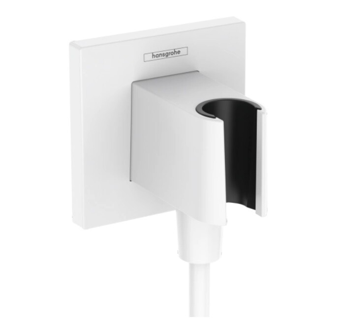 Шланговое подсоединение, Hansgrohe, Fixfit E, держатель-есть, со встроенным обратным клапаном, с подключением для душевого шланга, декоративная накладка, резьбовое соединение, стандарт подвода воды-1/2", цвет-белый матовый Шланговое подсоединение, Hansgrohe, Fixfit E, цвет-белый матовый