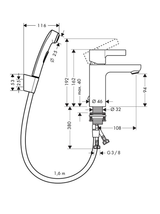 Смеситель для биде, Hansgrohe, Metris S, тип регулирования воды-керамический узел смешивания, отверстия для монтажа-2, высота, мм-162, вынос излива, мм-108, цвет-хром, регулируемое ограничение температуры, подходит для проточных водонагревателей, с ручным душем Смеситель для биде, Hansgrohe, Metris S, цвет-хром
