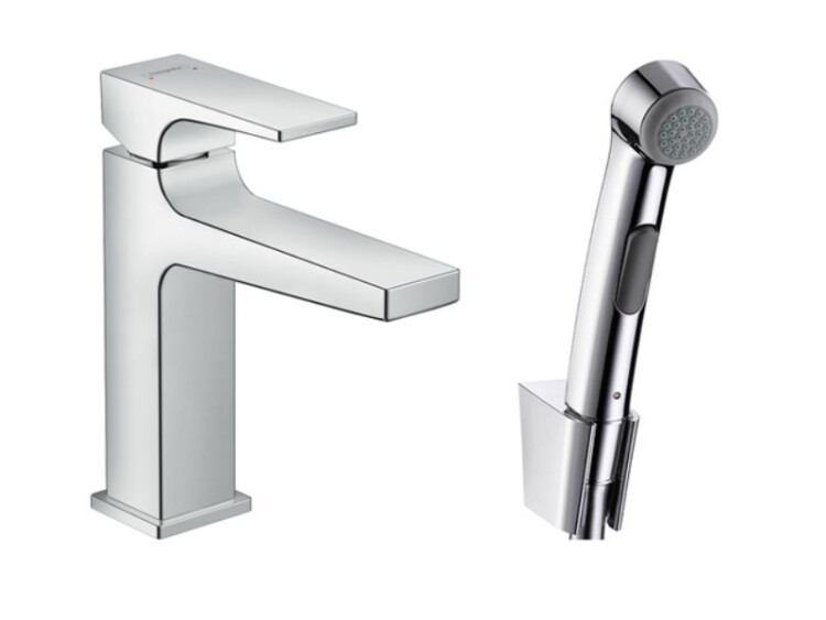 Смеситель для биде, Hansgrohe, Metropol, тип открывания воды-однорычажный, тип регулирования воды-керамический картридж, отверстия для монтажа-2, высота, мм-184, вынос излива, мм-135, донный клапан-есть, тип подводки-гибкая, цвет-хром, Гигиенический душ, со шлангом,мм-1600 и держателем, ½’ Смеситель для биде, Hansgrohe, Metropol, цвет-хром