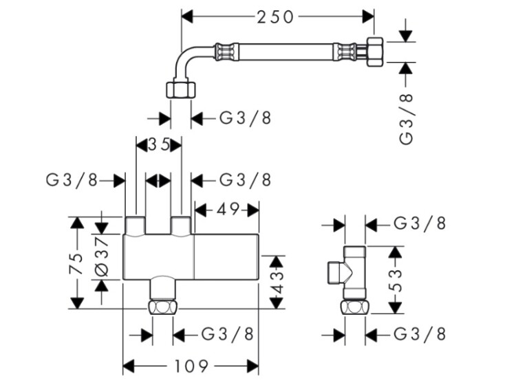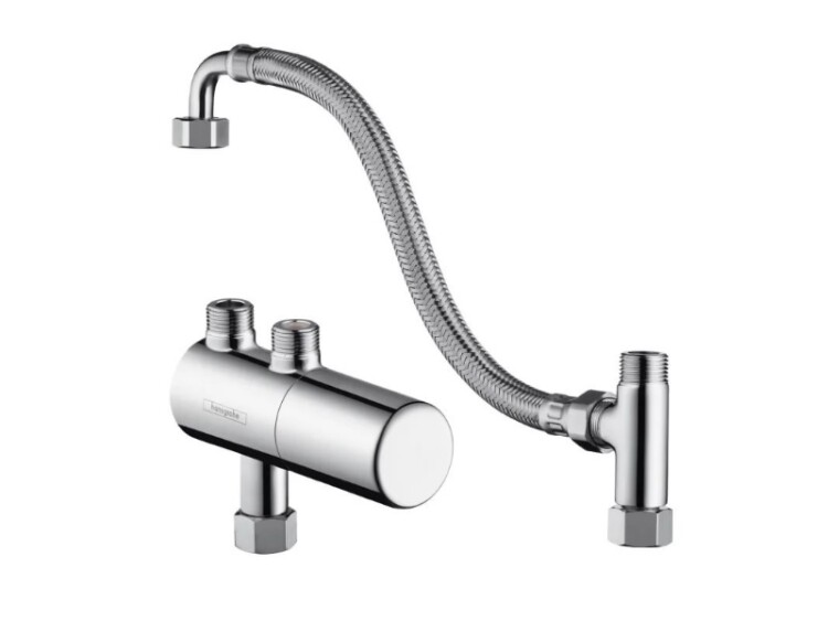 Смеситель для душа, Hansgrohe, Ecostat, тип регулирования воды-термостатический картридж, цвет-хром, с возможностью термической дезинфекции, комплект поставки-угловой вентильтермостата, соединительный шланг 250 мм G ⅜, Т-образное соединение G ⅜ Смеситель для душа, Hansgrohe, Ecostat, цвет-хром