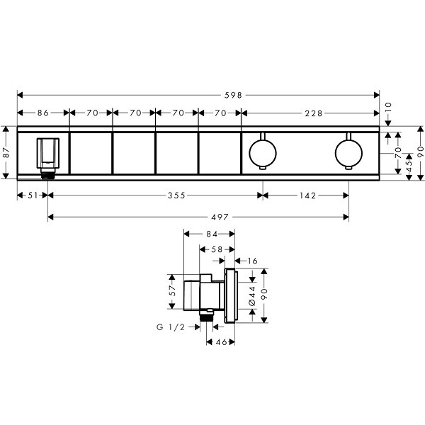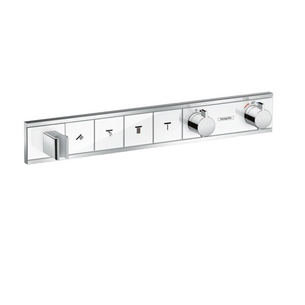 Смеситель для душа, Hansgrohe, RainSelect, тип открывания воды-с 4 кнопками, тип установки-встраиваемый, комплектация-ручка, гильза, розетка, функциональный блок, внутренняя часть-необходимо заказать, цвет-белый/хром, защита от обратного тока воды Смеситель для душа, Hansgrohe, RainSelect, цвет-белый/хром