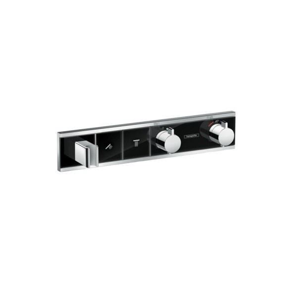 Смеситель для душа, Hansgrohe, RainSelect, тип открывания воды-с 2 кнопками, тип регулирования воды-термостатический картридж, тип установки-встраиваемый, комплектация-ручка, гильза, розетка, функциональный блок, внутренняя часть-необходимо заказать, цвет-черный/хром, защита от обратного тока воды Смеситель для душа, Hansgrohe, RainSelect, цвет-черный/хром