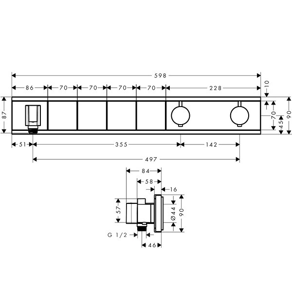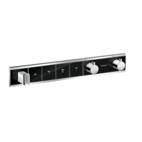 Смеситель для душа, Hansgrohe, RainSelect, тип открывания воды-с 4 кнопками, тип установки-встраиваемый, комплектация-ручка, гильза, розетка, функциональный блок, внутренняя часть-необходимо заказать, цвет-черный/хром, защита от обратного тока воды Смеситель для душа, Hansgrohe, RainSelect, цвет-черный/хром
