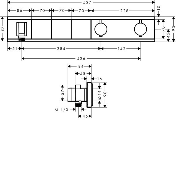 Смеситель для душа, Hansgrohe, RainSelect, тип открывания воды-с 3 кнопками, тип регулирования воды-термостатический картридж, тип установки-встраиваемый, комплектация-розетка, рукоятка, гильза, функциональный блок, цвет-черный/хром, защита от обратного тока воды Смеситель для душа, Hansgrohe, RainSelect, цвет-черный/хром