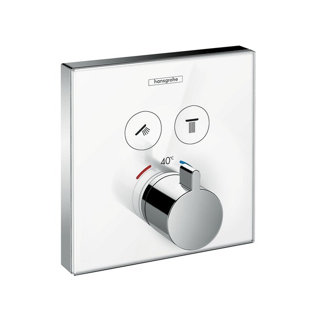 Смеситель для душа, Hansgrohe, ShowerSelect Glass, на 2 потребителя, тип регулирования воды-термостатический картридж, тип установки-встраиваемый, отверстия для монтажа-1, внутренняя часть-необходимо заказать, цвет-белый/хром Смеситель для душа, Hansgrohe, ShowerSelect Glass, цвет-белый/хром
