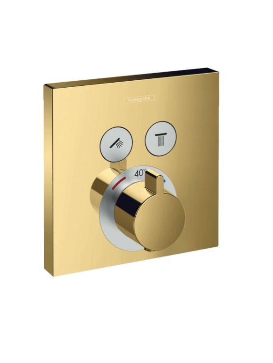 Смеситель для душа, Hansgrohe, ShowerSelect, тип открывания воды-нажимной (кнопки), тип регулирования воды-термостатический картридж, тип установки-встраиваемый, внутренняя часть-необходимо заказать, цвет-полированное золото, комплектация-ручка, накладка, гильза, блок смешивания, кнопки Смеситель для душа, Hansgrohe, ShowerSelect, цвет-полированное золото