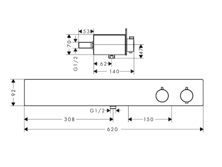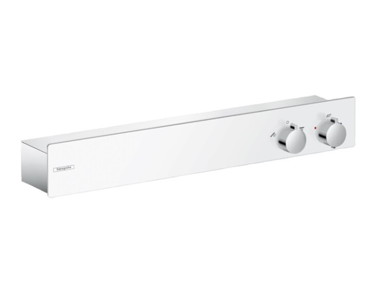 Смеситель для душа, Hansgrohe, ShowerTablet, тип открывания воды-вентильный, тип регулирования воды-термостатический картридж, тип установки-настенный, материал ручки-металл, цвет-белый/хром, запорно-переключающее устройство для 2 потребителей, поверхность полочки-анодированный алюминий, предохранительный ограничитель при 40°C, с шумопоглотителем Смеситель для душа, Hansgrohe, ShowerTablet, цвет-белый/хром