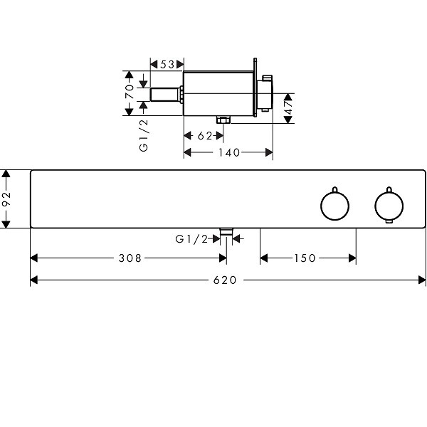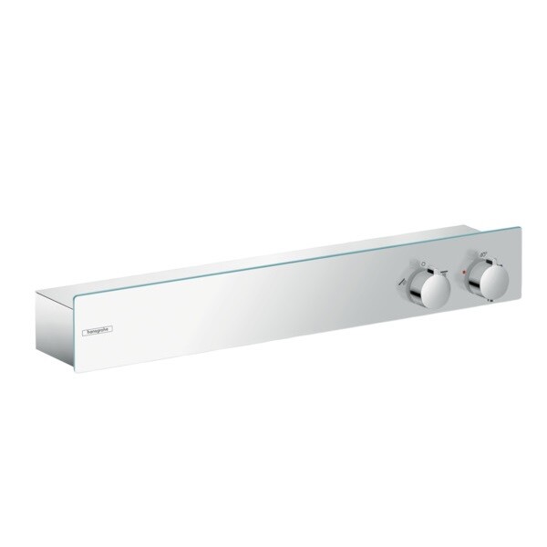 Смеситель для душа, Hansgrohe, ShowerTablet, тип регулирования воды-термостатический картридж, тип установки-встраиваемый, комплектация-с шумопоглотителем, цвет-хром, запорно-переключающее устройство для 2 потребителей, предохранительный ограничитель при 40°C, поверхность полочки: анодированный алюминий Смеситель для душа, Hansgrohe, ShowerTablet, цвет-хром