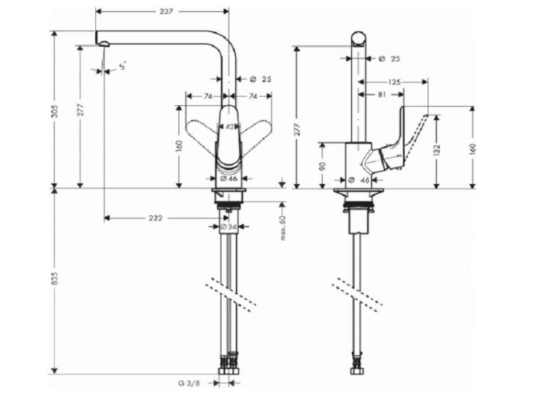 Смеситель для кухни, Hansgrohe, Focus M41, с возможностью размещения рукоятки справа или слева, тип открывания воды-однорычажный, тип регулирования воды-керамический картридж, монтаж-на раковину/столешницу, отверстия для монтажа-1, высота, мм-305, вынос излива, мм-222, тип излива-поворотный, тип подводки-гибкая, стандарт подвода воды-3/8", цвет-черный матовый Смеситель для кухни, Hansgrohe, Focus M41, цвет-черный матовый