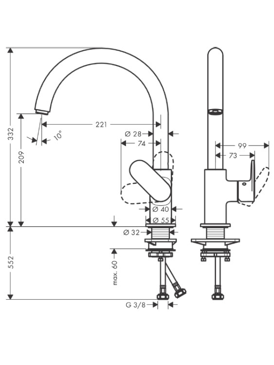 Смеситель для кухни, Hansgrohe, Vernis Blend M35, тип открывания воды-однорычажный, тип регулирования воды-керамический картридж, монтаж-на раковину/столешницу, отверстия для монтажа-1, высота, мм-332, вынос излива, мм-221, тип излива-поворотный на 120° или 360°, тип подводки-гибкая, стандарт подвода воды-3/8", цвет-хром Смеситель для кухни, Hansgrohe, Vernis Blend M35, цвет-хром