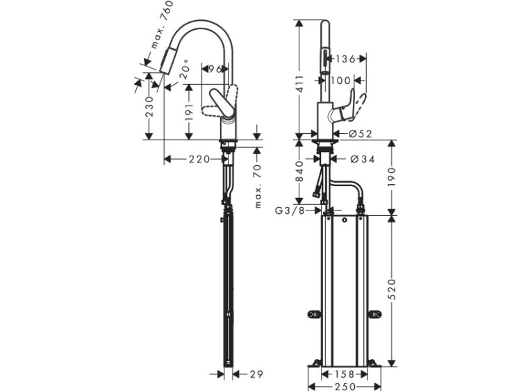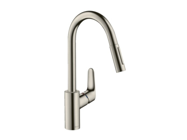 Смеситель для кухни, Hansgrohe, Focus M41, sBox, тип открывания воды-однорычажный, тип регулирования воды-керамический картридж, монтаж-на раковину/столешницу, отверстия для монтажа-1, высота, мм-406, вынос излива, мм-220, тип излива-выдвижной, поворотный 110° или 150°, переключение струи в исходное положение нажатием кнопки, магнитная система крепления душа MagFit, тип подводки-гибкая, стандарт подвода воды-3/8", цвет-сталь Смеситель для кухни, Hansgrohe, Focus M41, sBox, цвет-сталь