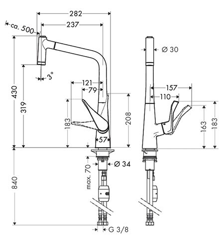 Смеситель для кухни, Hansgrohe, Metris M71, тип открывания воды-однорычажный, тип регулирования воды-керамический картридж, монтаж-на раковину/столешницу, отверстия для монтажа-1, высота, мм-430, вынос излива, мм-237, тип излива-выдвижной, поворотный, 2 режима струи-ламинарная струя, душевая струя, тип подводки-гибкая, стандарт подвода воды-3/8", цвет-хром Смеситель для кухни, Hansgrohe, Metris M71, цвет-хром
